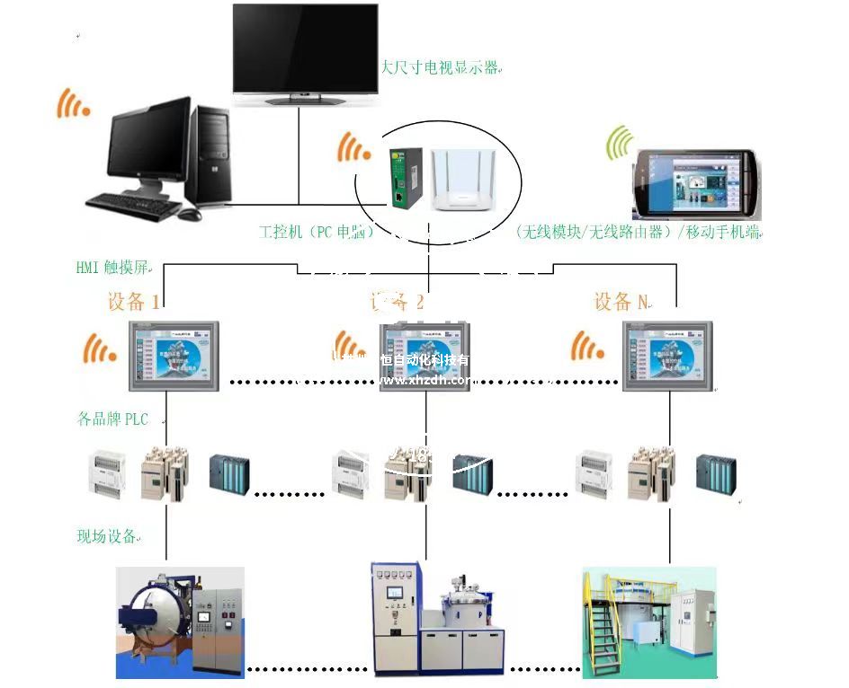 本控制系統(tǒng)以用戶現(xiàn)有真空工業(yè)爐(石墨化爐、炭化爐、真空燒結(jié)爐、粉末冶金爐)設(shè)備,通過(guò)PLC+HMI+無(wú)線遠(yuǎn)程模塊控制實(shí)時(shí)監(jiān)控現(xiàn)場(chǎng)設(shè)備數(shù)據(jù)信息,采用無(wú)線遠(yuǎn)程物聯(lián)網(wǎng)模塊,實(shí)時(shí)上報(bào)生產(chǎn)中設(shè)備的數(shù)據(jù)給生產(chǎn)監(jiān)控中心,以電腦監(jiān)控軟件+手機(jī)APP軟件實(shí)現(xiàn)雙向監(jiān)控設(shè)備運(yùn)行中的數(shù)據(jù)、狀態(tài)信息并把報(bào)警內(nèi)容以短信發(fā)/微信的形式發(fā)送給企業(yè)生產(chǎn)人員或企業(yè)領(lǐng)導(dǎo)。本控制系統(tǒng)為無(wú)線遠(yuǎn)程集中監(jiān)控系統(tǒng)可實(shí)現(xiàn)對(duì)現(xiàn)場(chǎng)工業(yè)爐或生產(chǎn)設(shè)備的集中監(jiān)測(cè)及監(jiān)控,提高生產(chǎn)效率,降低事故率,減少故障處理時(shí)間、減少現(xiàn)場(chǎng)操作人員、提高經(jīng)濟(jì)效益。