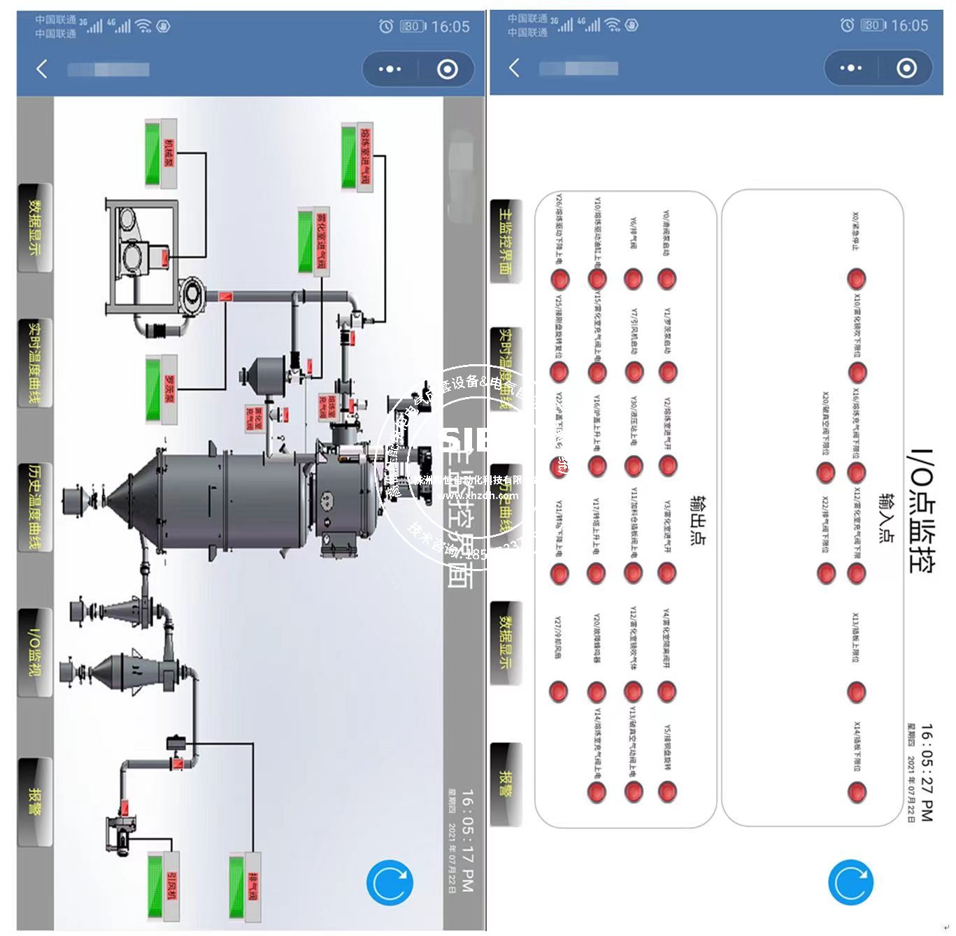 本控制系統(tǒng)主要畫面內(nèi)容有:監(jiān)控主畫面、實(shí)時(shí),歷史曲線畫面、實(shí)時(shí),歷史報(bào)警畫面、參數(shù)設(shè)置畫面、工藝參數(shù)畫面、輸入輸出畫面。
