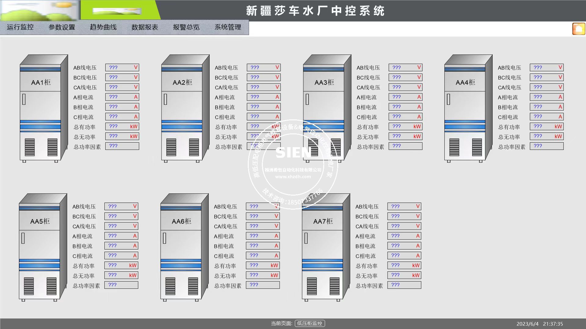 - A.總畫面:表現(xiàn)的是整個(gè)水廠的水處理工藝(立體圖形式),從取水、投藥、投氯、絮凝沉淀、過濾到供水。在相關(guān)位置顯示水處理的各主要控制參數(shù)以及重要設(shè)備的主要控制參數(shù),可以點(diǎn)擊進(jìn)入各分站。