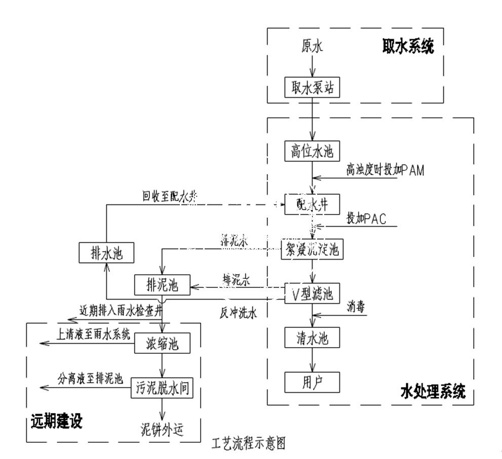 本水廠凈水工藝流程為:加壓取水——高位水池——配水井——絮凝沉淀池——V型濾池——清水池——用戶。